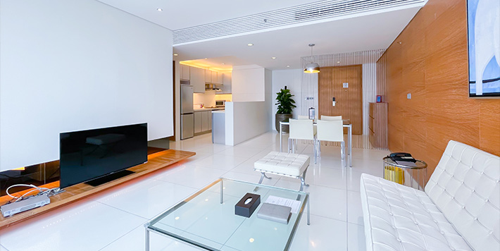 面积为114-131㎡,床数为2张,1张1.8m*2m和2张1.5m*2m。设计现代、简约、公寓内均配有洗衣机、冰箱、微波炉等家电,设施配套齐全,让您在感受商务便利、体会优质生活的同时,延续家居温馨。